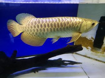 成鱼的鳞框则呈金黄色,并且包括整个鱼背,各鳍均呈金红色。鳞片亮度达到第六排,呈现出厚重质感。金质达到24K金程度。珠鳞全满或80%以上。尤其是鳃盖上的金黄印记更为明显。体长35厘米——50厘米以上,此阶段过背金龙的生长缓慢。这个阶段控制饮食,一天或者两天喂食一次。以鱼虾为主食,昆虫类为辅。
