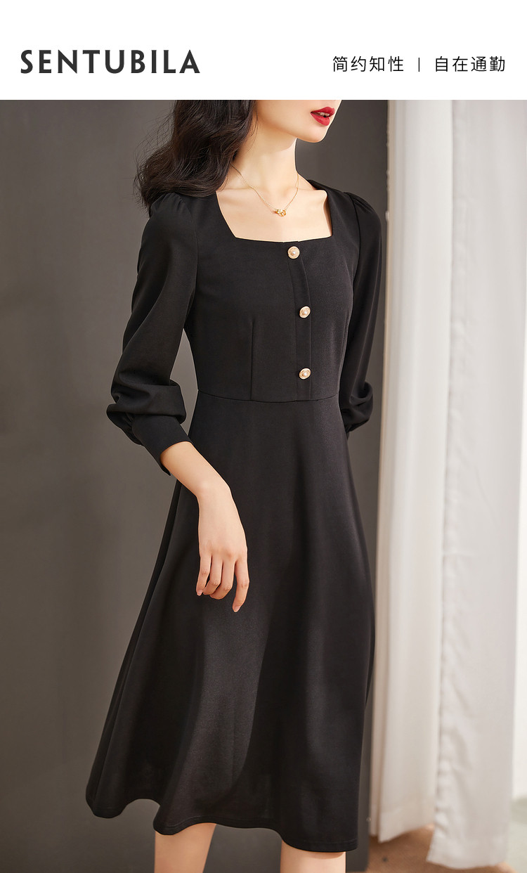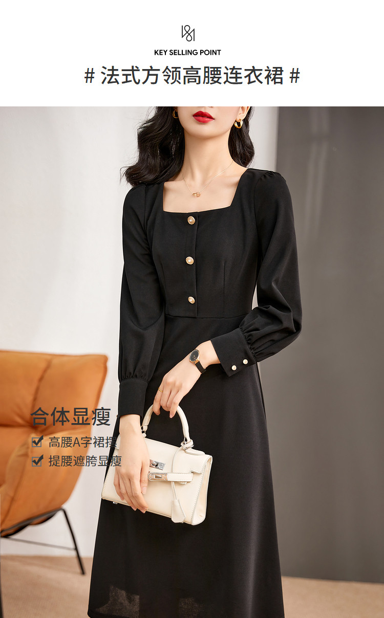 【知性气质】21秋季新款裙子心动方领泡泡袖高腰a字连衣裙