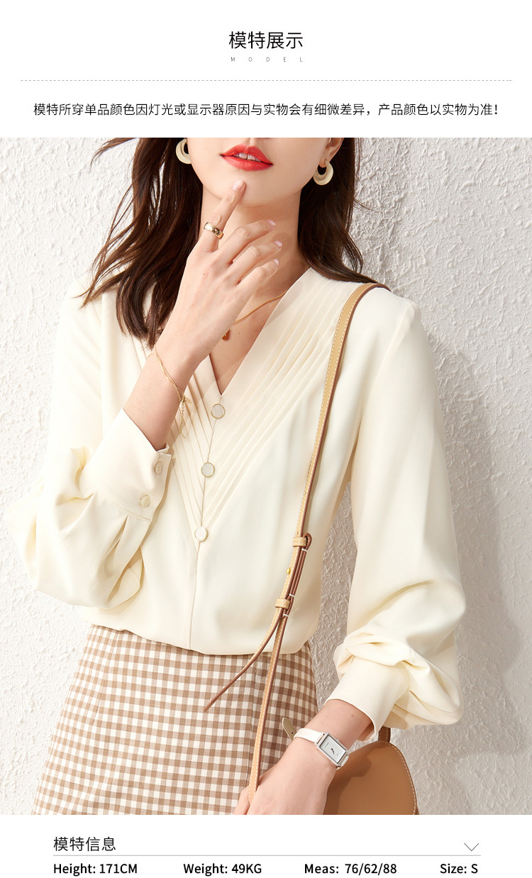 v领衬衫女2021春秋季新款雪纺衫气质纯色压褶打条衬衫