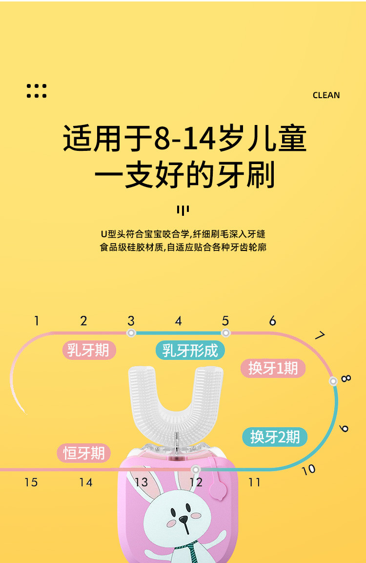 【加慕斯牙膏】儿童电动牙刷U型全自动懒人牙刷软毛硅胶刷头粉兔