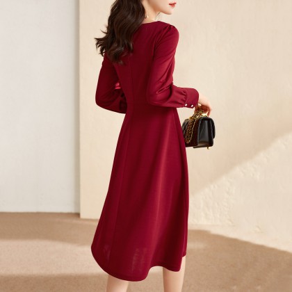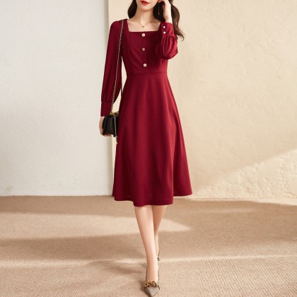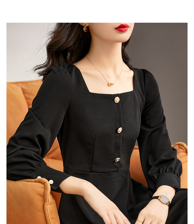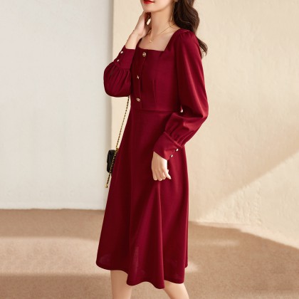【知性气质】21秋季新款裙子心动方领泡泡袖高腰a字连衣裙