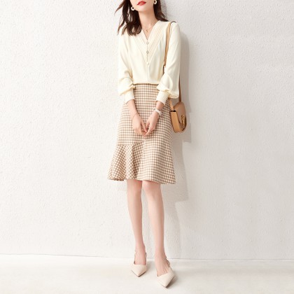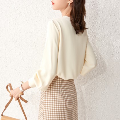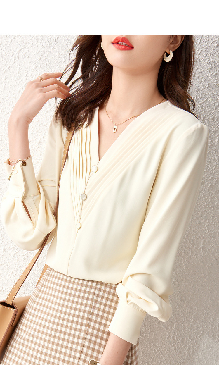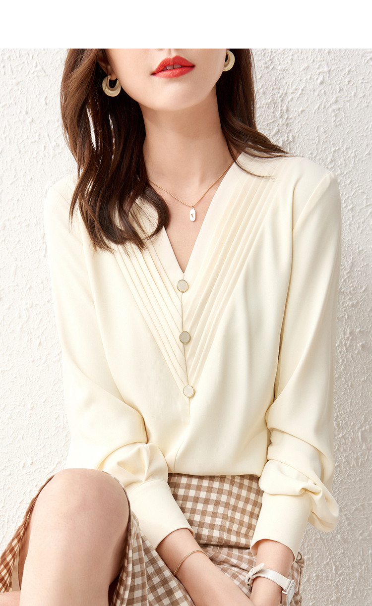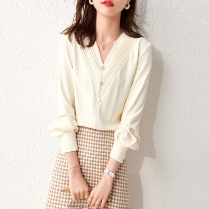 v领衬衫女2021春秋季新款雪纺衫气质纯色压褶打条衬衫